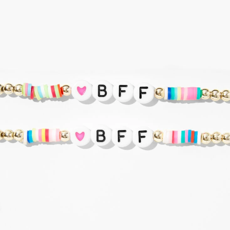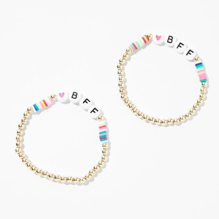 Match your bestie with this two-pack stretch bracelet set. It includes beaded gold-tone bracelets with “BFF” beads.