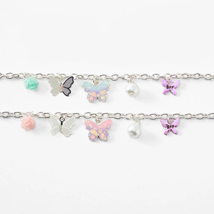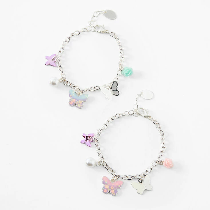 Show your bestie how to flutter in style in these butterfly charm bracelets. This set includes one bracelet for you and one for her, each with with a variety of butterfly charms.