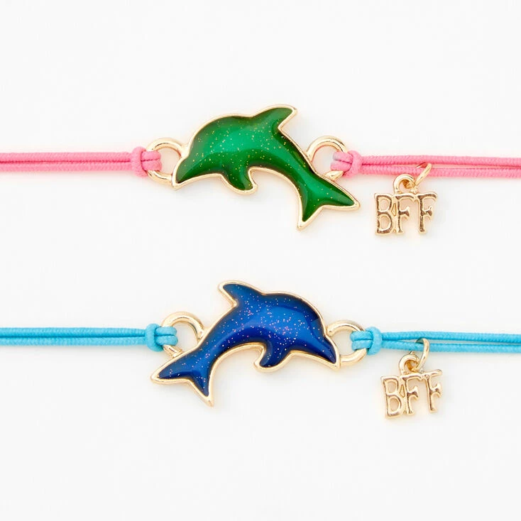 Share the love with your bestie! This set includes two cord bracelets, one in pink & one in blue. One for me & one for you. Each adjustable bracelet has a tiny “BFF” charm, written in a funky & fun gold-tone script, and a dolphin charm, attached with matching gold-tone hardware. The dolphin charm changes color based on your mood! Keep you and your bestie in tune with these aquatic accents!