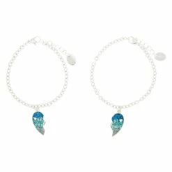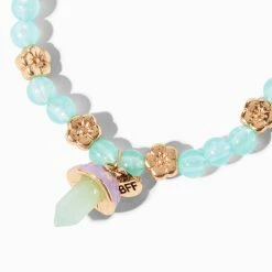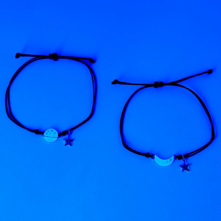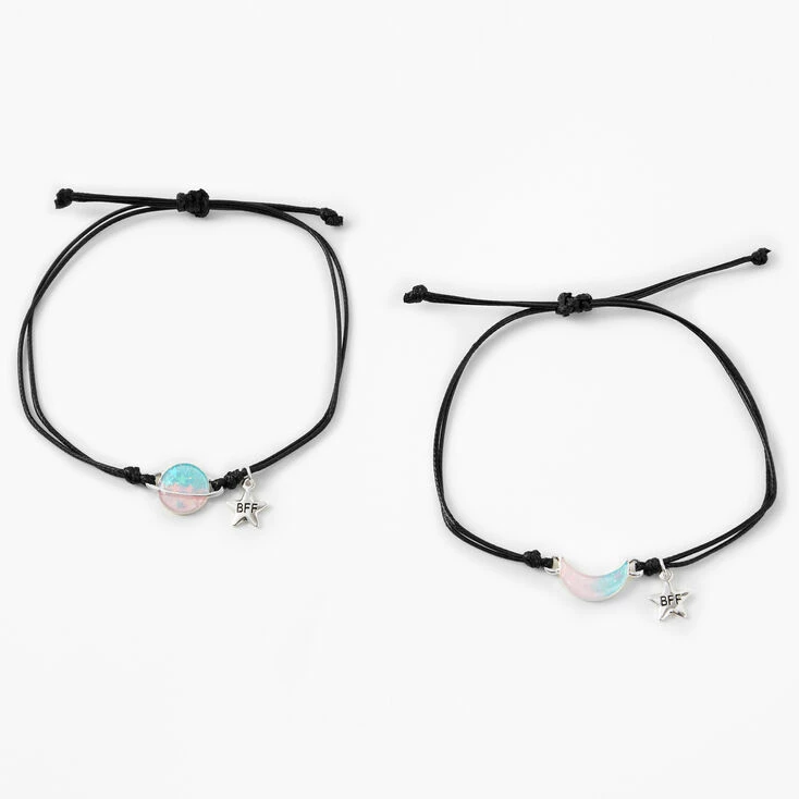 The planets have aligned. Represent connection AND fate with these moon & planet, adjustable friendship bracelets.With each bracelet representing part of the universe, share one with your celestial lovin’ BFF. These bracelets make for a simplistic accessory for any outfit. Ombre of light pink to blue, with dainty glitter flecks make-up the moon and planet charms, and stand contrasting from the black, adjustable bracelet. Each bracelet has a silver-tone, star charm that reads “BFF” in block lettering. Watch as the tides effect you while wearing these bracelets.