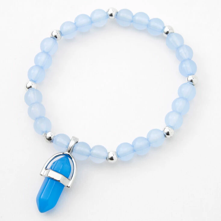 Beaded stretch bracelets are so much fun to mix, match, and stack! This one features a faux mystical gem in blue that glows in the dark, making it extra special.