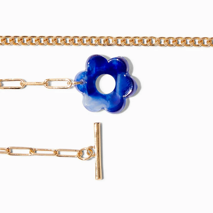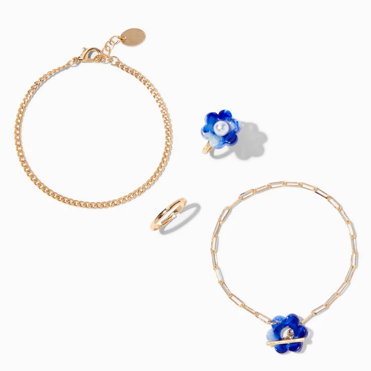 Decorate your hands with this stunning set. It includes two bracelets and two adjustable rings. All are gold-tone with blue swirl marbleized floral details.