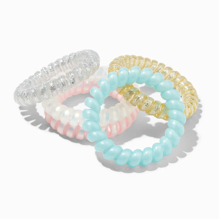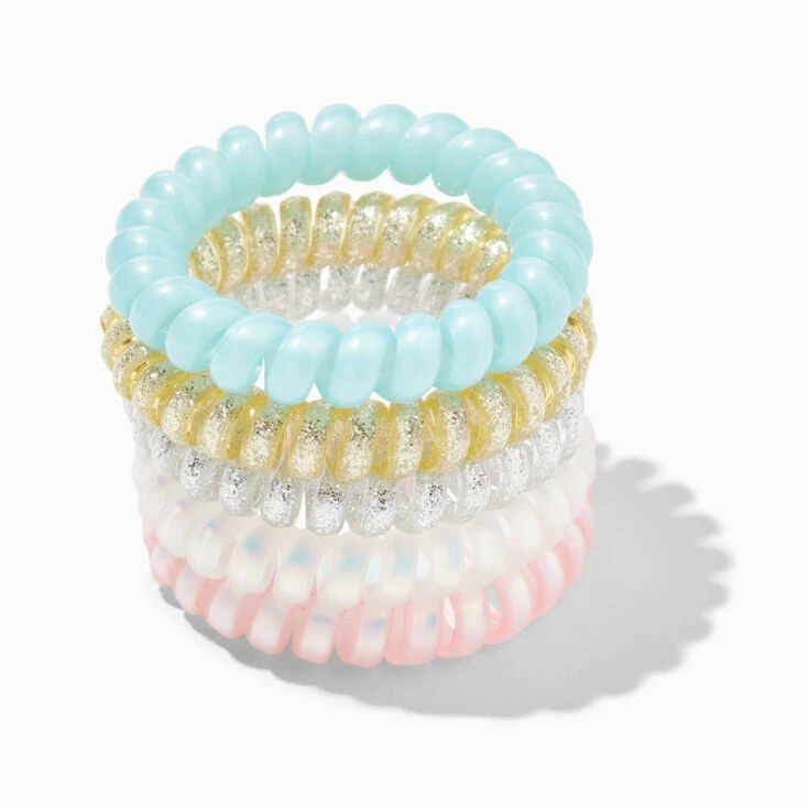 Add a pop of color to your look with these coil bracelets. Set comes with 5 bracelets in pastel pink, baby blue, pearlized, and gold & silver glitter.