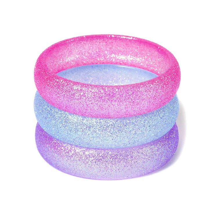 Stack them up or wear them solo. This set includes three glittery bangle bracelets in pastel pink, blue and purple.