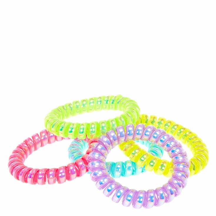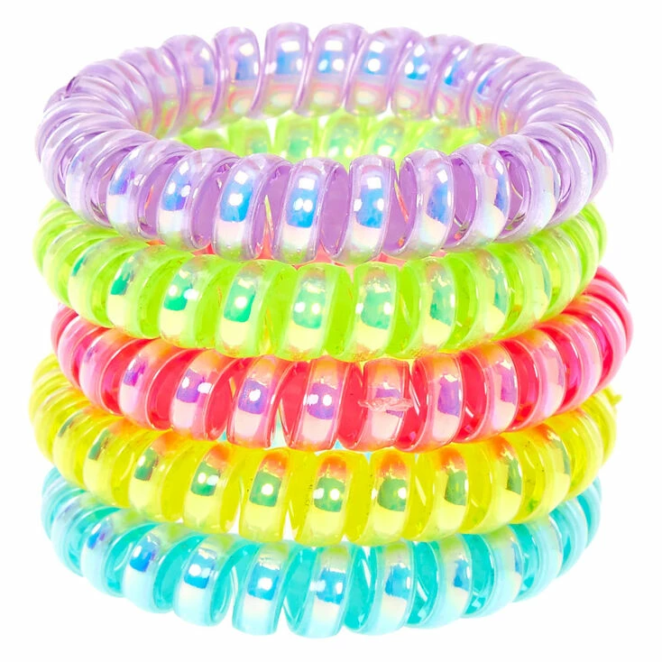 These neon bracelets electrify style with iridescent shine and retro spiral design. Perfect for bright party style. Includes one in each colour: pink, purple, yellow, green, and blue.