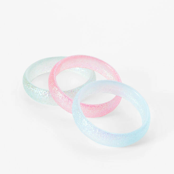 Stack them up or wear them solo. This set includes three glittery bangle bracelets in pastel pink, blue and green.