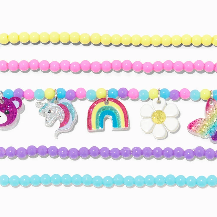 If you love rainbow hies & bracelets, then this set is perfect for you! The set includes 5 bracelets, all colors of the rainbow, and one with the glitziest charms Claire’s can offer. Stack them for a Spring-time arm party, or share with your besties.
