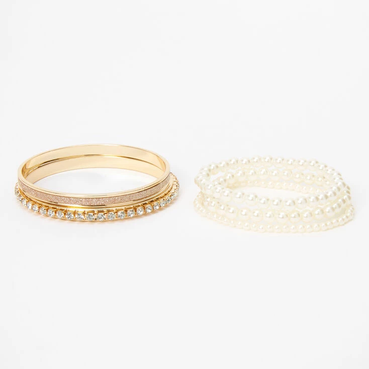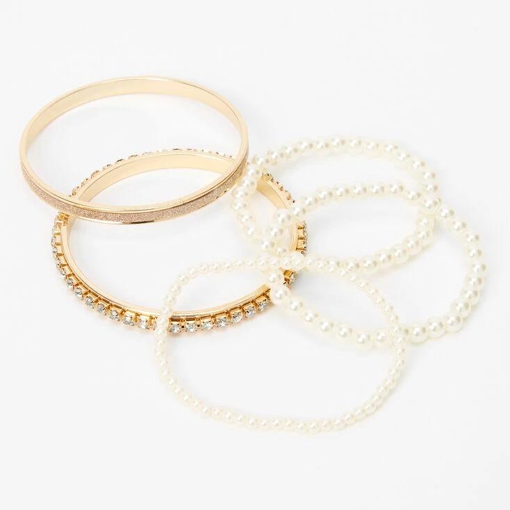 Get the best of both worlds with this mixed set of bracelets! This set includes 2 rose gold-tone bangle bracelets and 3 faux pearl stretch bracelets.