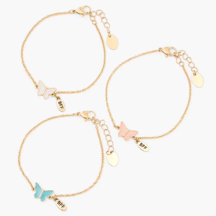 Get the best accessories for your outfit with this bracelet set! This bracelet set includes 3 different chain bracelets with dangly butterfly charms to create the perfect arm party to complete any look.