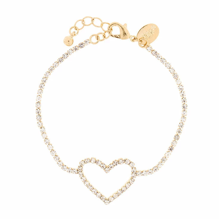 Dainty bracelet features one row of sparkling faux rhinestones and a sweet heart outline. Mix and match with your other favourite bracelets!