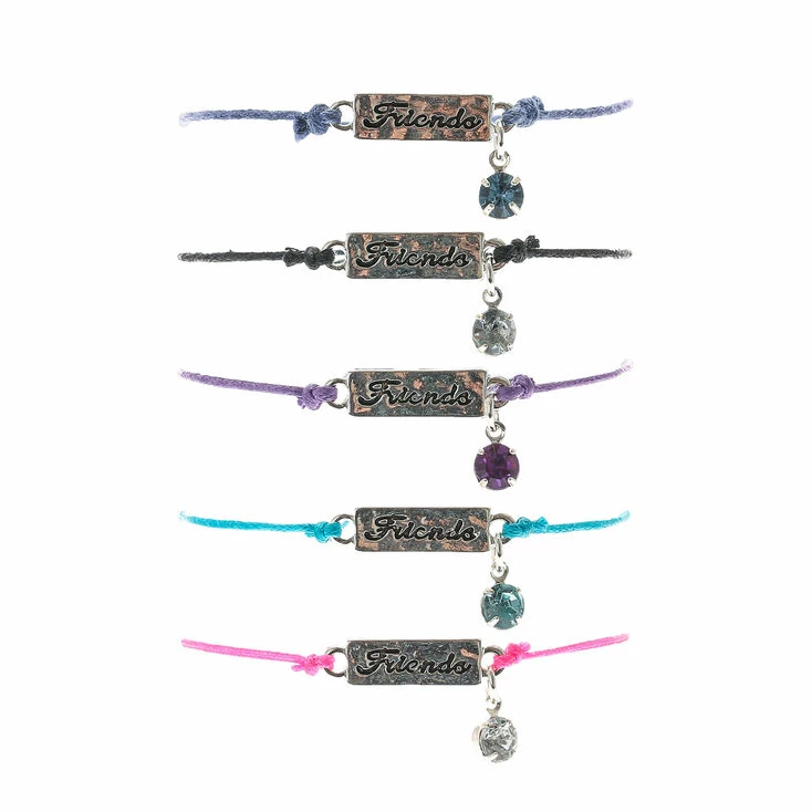 Glam up your bestie squad by each wearing one of these cute cord friendship bracelets. Includes 5 different colours and each has a silver-tone bar reading ‘Friends’ with a matching stone charm.