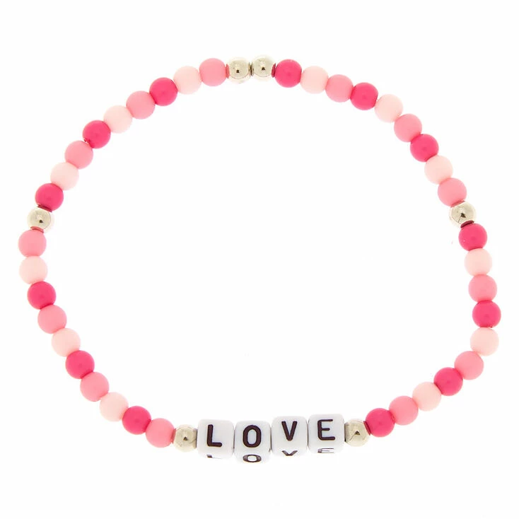 Show off your romantic side with this pretty pink bracelet! White letter beads spelling out the word “Love” accent a pink beaded stretch bracelet.