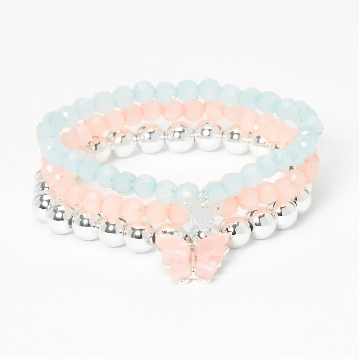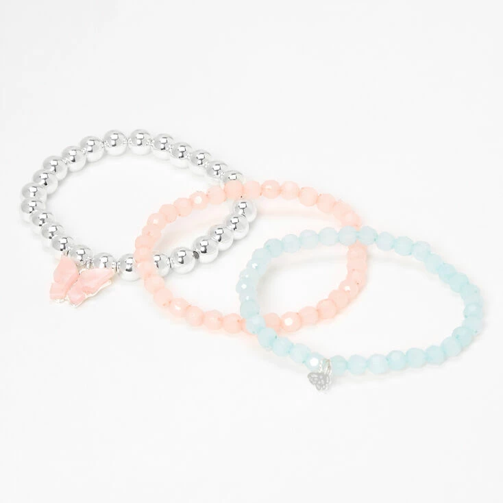 Wear one, two, or all three together! Set of three includes a blush pink bracelet with a butterfly charm, a light blue bracelet with a smaller butterfly charm, and a coordinating silver-tone beaded bracelet.