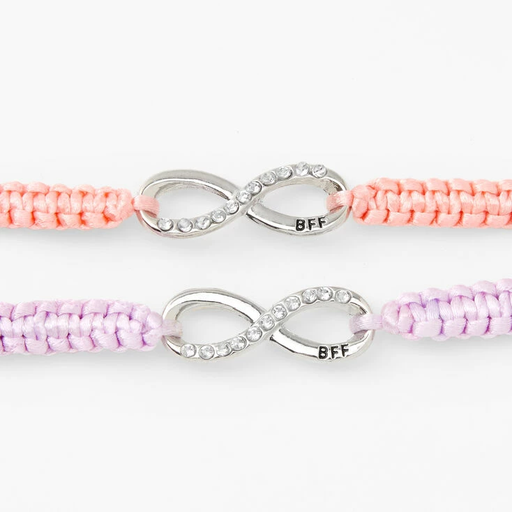 Coordinate with your bestie this spring with this pair of friendship bracelets! Set includes two silver-tone infinity symbol statement bracelets featuring pink and purple adjustable bands.
