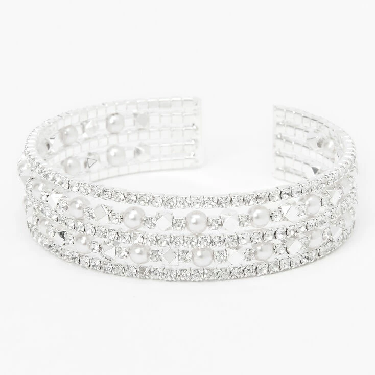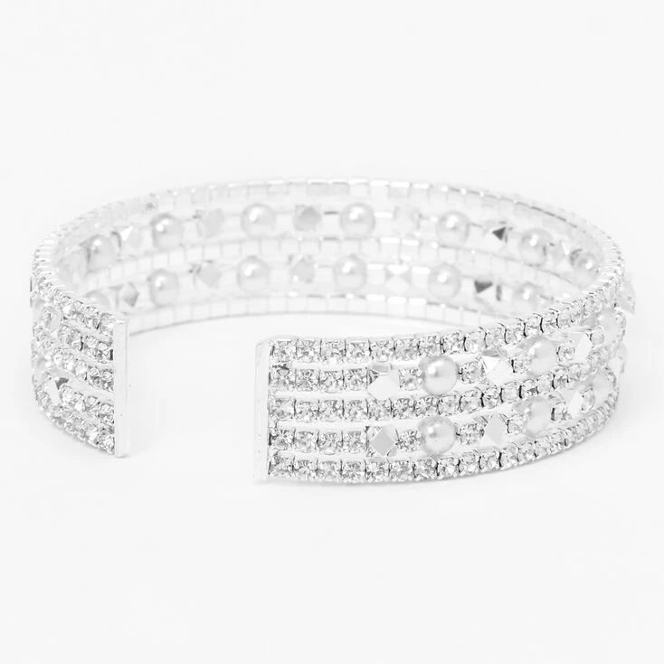 And elegant cuff bracelet makes a big statement on holidays and special occasions. It features five rows of faux pearls and faux rhinestones that sparkle and shine as you move your wrist.