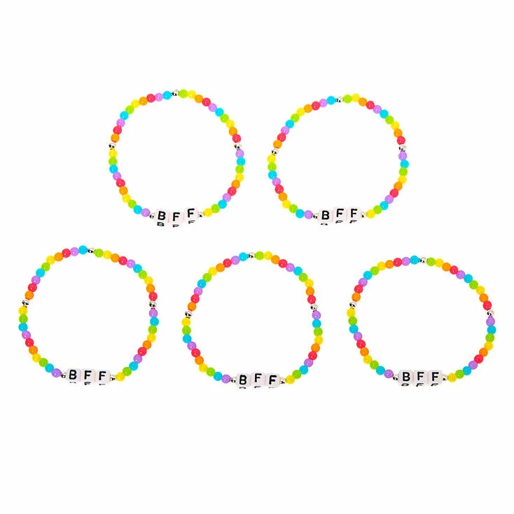 Coordinate with all your besties with these super cute bracelets! Set includes five rainbow bracelets with BFF beads.