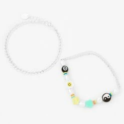 This bracelet set has a whole lot of vibe! The stretch silver-tone braceletย has faux pearls, happy face daisy beads,ย an 8 ball, a yin yang, and more for maximum flair.ย Wear it by itself or stack it with the included Cuban chain-style bracelet.