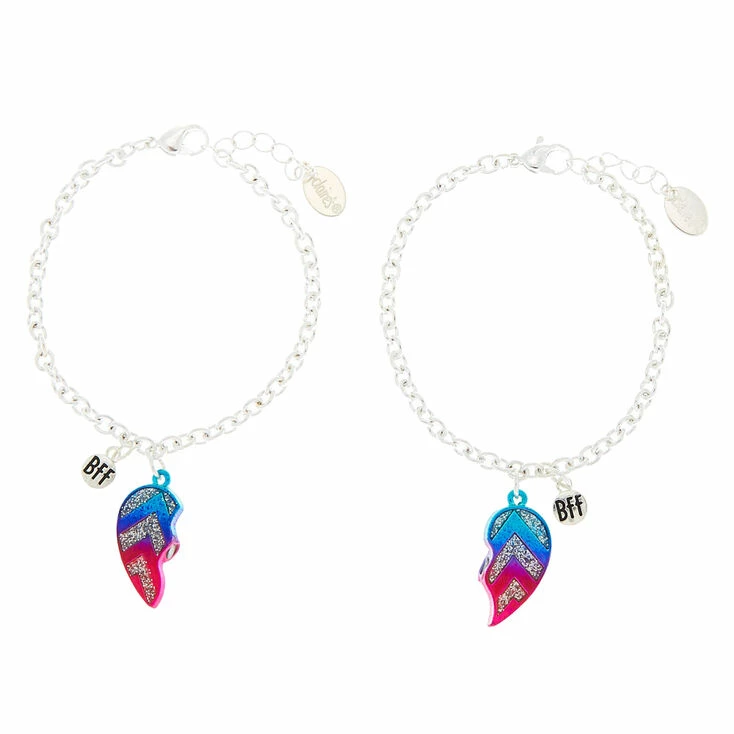 Show your bestie how much you love her with these adorable matching bracelets! This pack includes 2 silver-tone bracelets with half of a heart dangling from each one that makes a complete heart when the bracelets are put together.