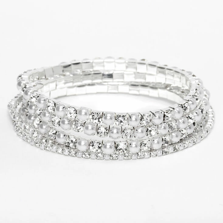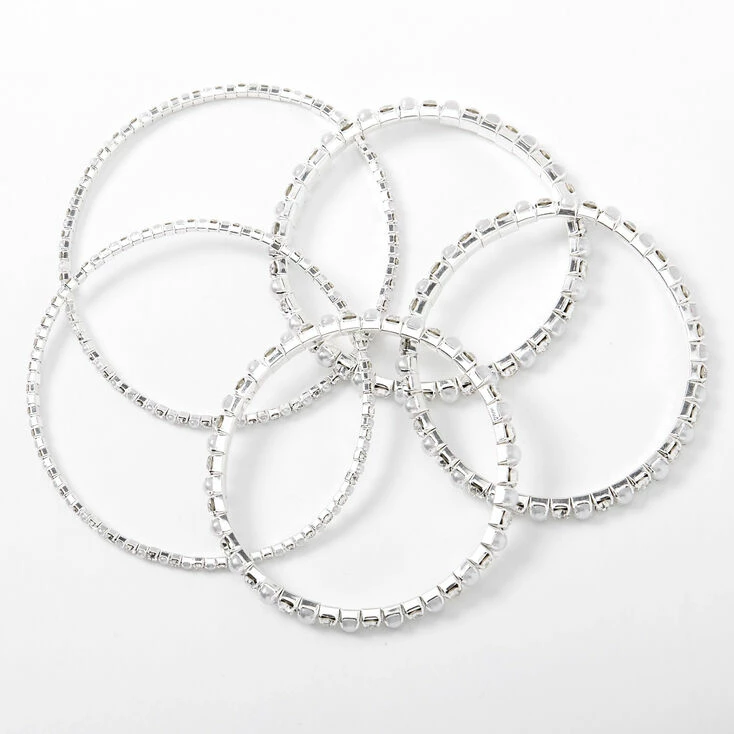 Sparkle bright and look classy with this stack of stretch bracelets! Silver-tone set includes three glass rhinestone/pearl bracelets and two dainty glass rhinestone/pearl bracelets.