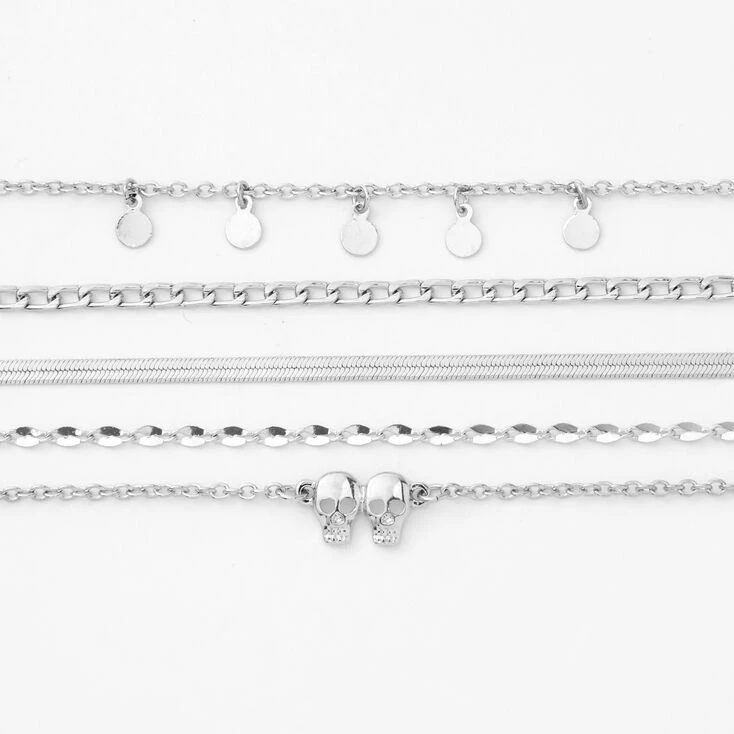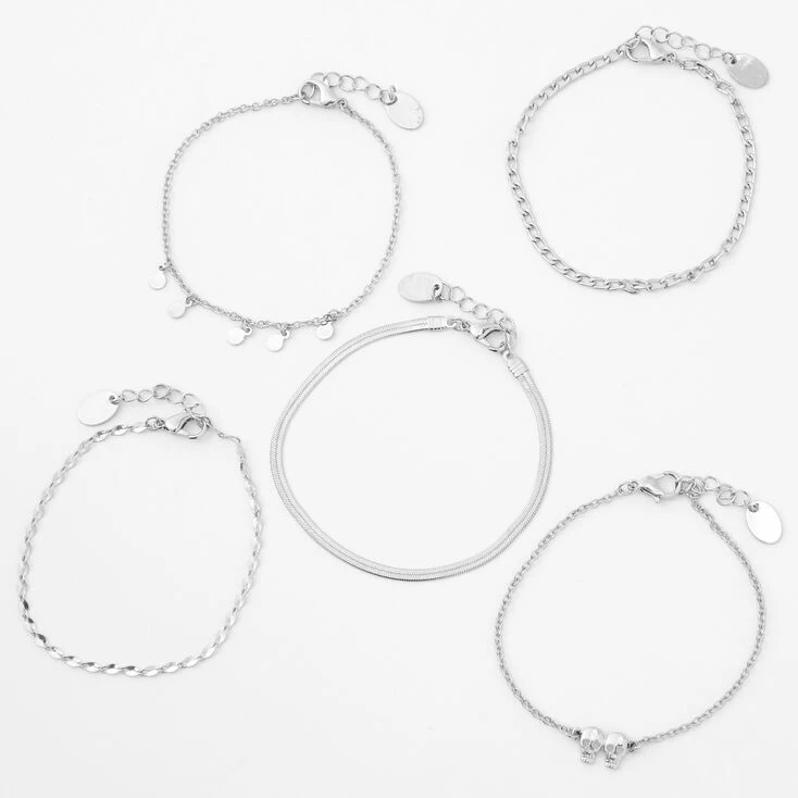 Stack these bracelets in different combinations to create a new look each day! The set includes all 5 silver-tone chain bracelets shown, one with two skull charms and the other four featuring assorted chain styles, including one with a “twisted” look.