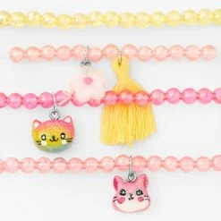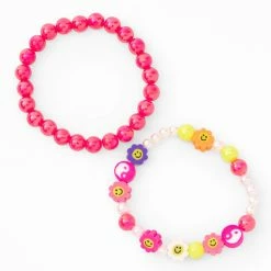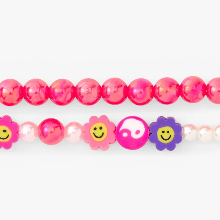 Brighten your day with this colourful bracelet set! The set of two beaded stretch bracelets includes one in bright pink and another with floral happy faces, yin yang symbols, and faux pearls. Wear them separately or stack them together for a fun finishing touch to your outfit.